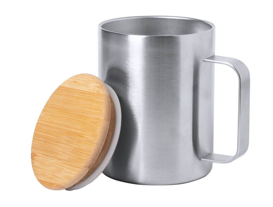Pozīcijas numurs: 2215Metāla krūzīte ar bambusa vāciņu un gravējumu