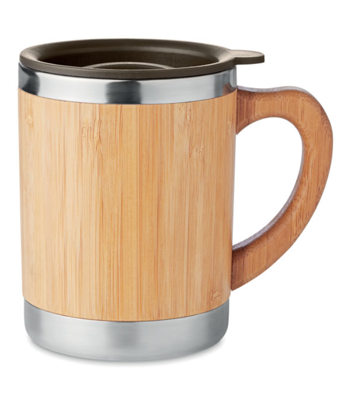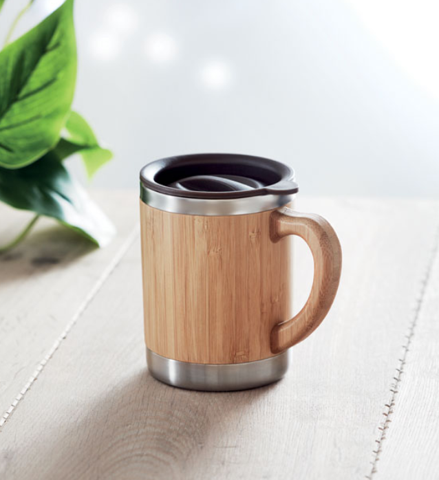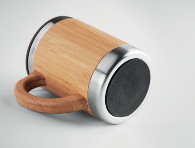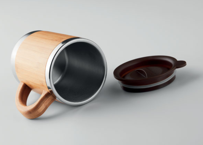 Кружка с двойными стенками из нержавеющей стали, корпус и крышка из бамбука. Получатель визуального подарка напоминает бочонок пива.