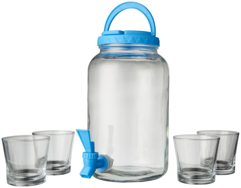 Stikla dzērienu dozators aukstu dzērienu pasniegšanai. Ietver lielu atvērumu ar skrūvi uz vāka, lai atvieglotu tīrīšanu un uzpildīšanu. Komplektā ietilpst 4 glāzes. Ideāli piemērots ballītēm, pasākumiem, piknikiem un darbiniekiem. Prezentēts Avenue dāvanu kastē.